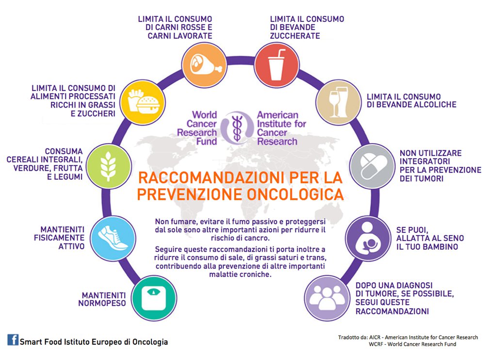 Il World Cancer Research Fund, vale a dire la più importante organizzazione mondiale che si occupa dello studio del cancro e della prevenzione attraverso lo stile di vita, negli ultimi anni ha pubblicato un importantissimo decalogo con le 10 raccomandazioni che consentono di ridurre la comparsa della maggior parte dei tumori. A questo link puoi visionare tutta la documentazione: https://www.wcrf.org/dietandcancer/cancer-prevention-recommendations.